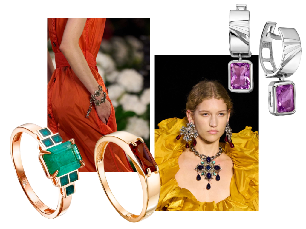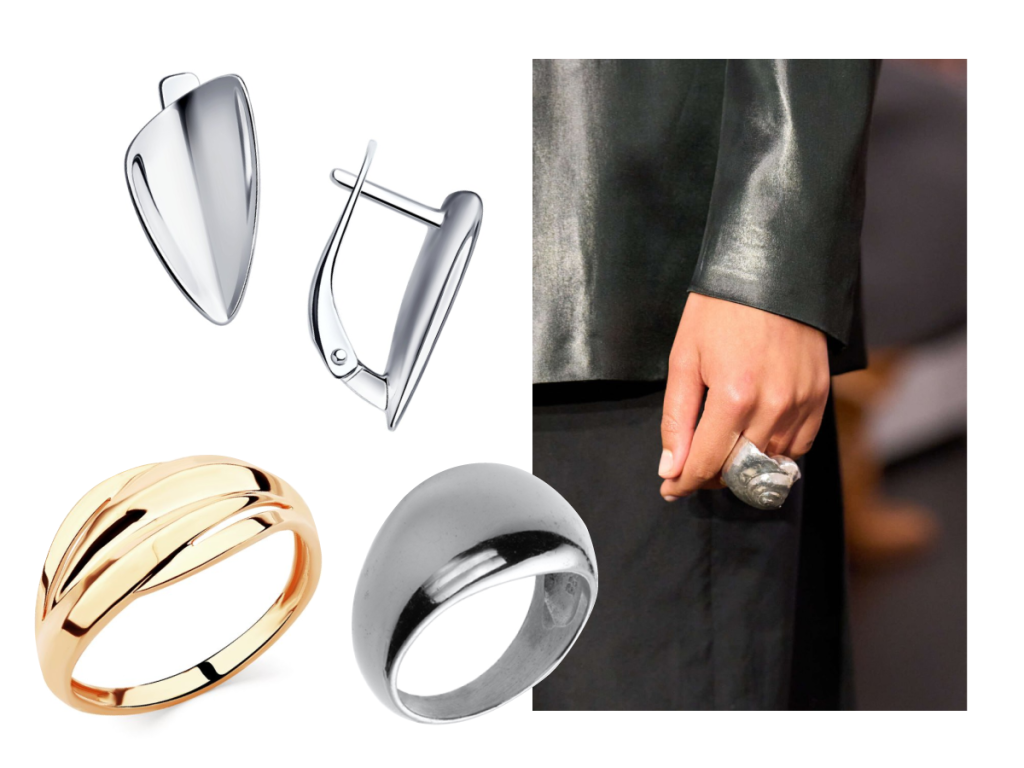 Как носить: добавляйте золотые серьги с камнями или кольца из серебра как яркий акцент в монохромный образ, либо играйте на контрастах. Главное правило тренда – сложные, глубокие цвета и крупная форма.