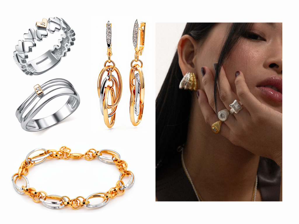 Когда-то это сочетание считалось модным табу, но сегодня мы говорим: шах и мат всем пуристам. Микс золота и серебра – абсолютный фаворит стилистов и дизайнеров. Такие украшения выглядят сложнее, фактурнее и визуально богаче.