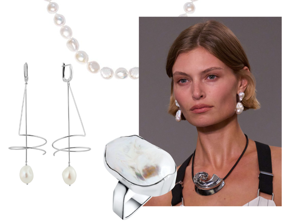 Важное уточнение – речь идёт о барочном жемчуге... Или хотя бы не идеально ровном. С каждым сезоном этот тренд становится всё более выразительным и заметным. При этом он не уходит в гротеск – напротив, украшения с крупным, массивным жемчугом делают образ утончённым, дорогим и очень собранным.