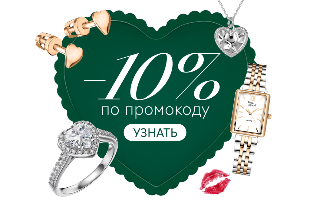 Любовь витает в воздухе, а специальный промокод ко Дню всех влюблённых даёт скидку ещё -10% на все украшения в чеке, чтобы вам было легче порадовать вашу половинку драгоценным сюрпризом.